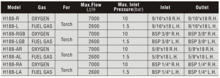 Filter protect the flashback arrestor from dirty particles. Non-return vavle. Max flow: 0xygen: 7000Lt./H Acetylene: 2600Lt./H. Max working pressure: 0xygen: 10Bar Acetylene: 1.5Bar Fuel gas: 5Bar.