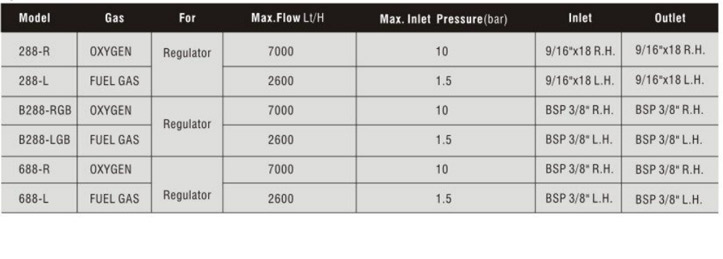 Max flow: Oxygen: 7000Lt./H Acetylene: 2600Lt./H
