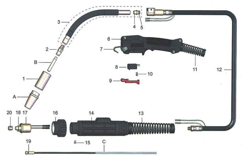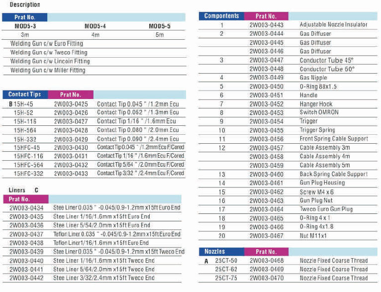 Welding Gun c/w Euro Fitting Rating:500A CO2 400A mixed gas ,60% duty cycle.wires:0.035-3/32"