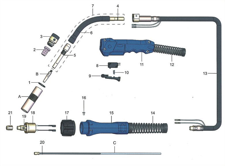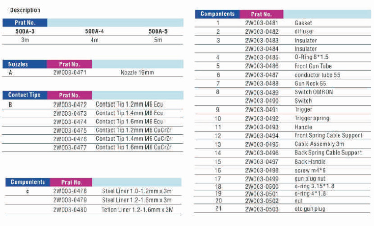 Welding Gun c/w Euro Fitting Rating:500A CO2 420A mixed gas ,60% duty cycle.wires:1.2-1.6mm