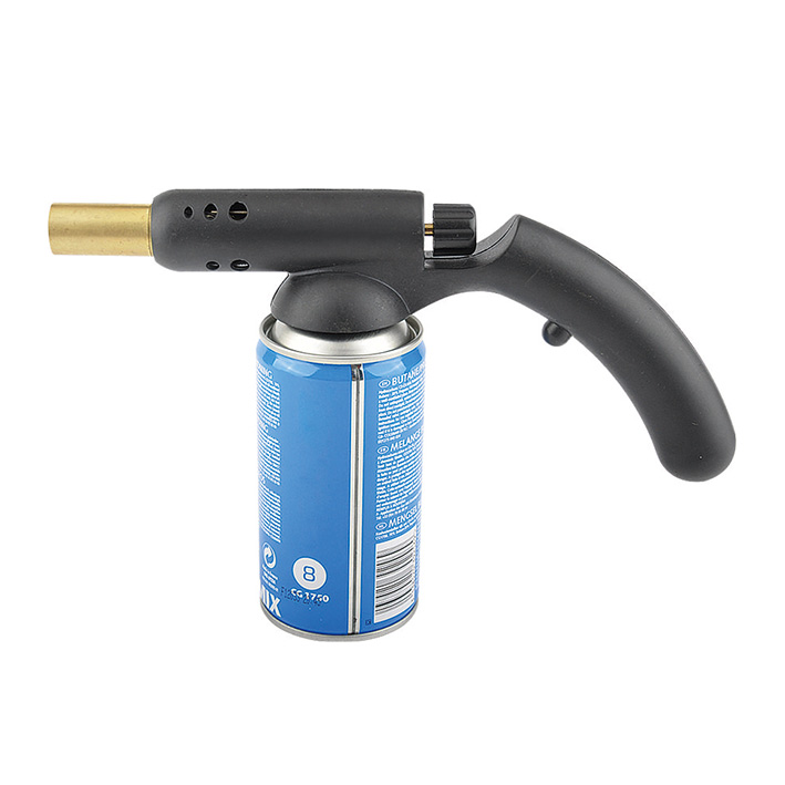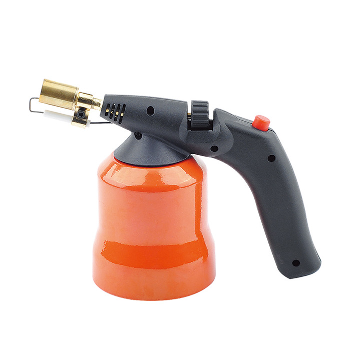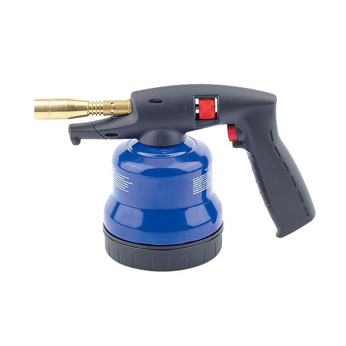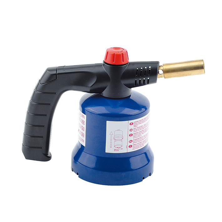 Portable gas blow torch. Brass gun,steel container,ABS handle Consumption:130g/h Max. temp.:850 Degree Celsius Each pc packed in a color box,20pcs or 24pcs packed in 1 carton. Fuel:butane gas cartridge Piezo electric ignition