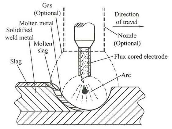 FCAW is similar to MIG welding, as the power source can perform both types of welding. MIG welding needs filler wire working as an electrode fed continuously from the gun. Conversely, FCAW has a wire with its core as flux and creates a gas shielding zone around the weld. No need for any external shielding gas in this welding type. The process is versatile and works for thick metals.